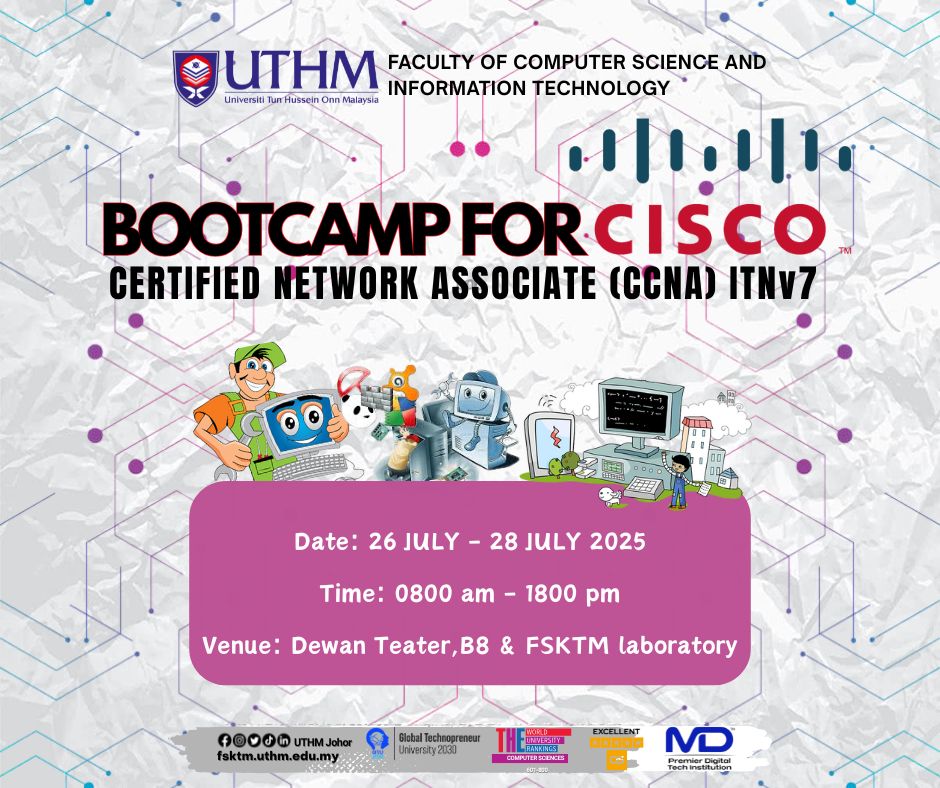 We are glad to share the successful execution of the CCNA ITNv7 BOOTCAMP, conducted on 26–28 July 2025, for 246 students from the Bachelor of Information Technology and Bachelor of Computer Science, FSKTM UTHM.