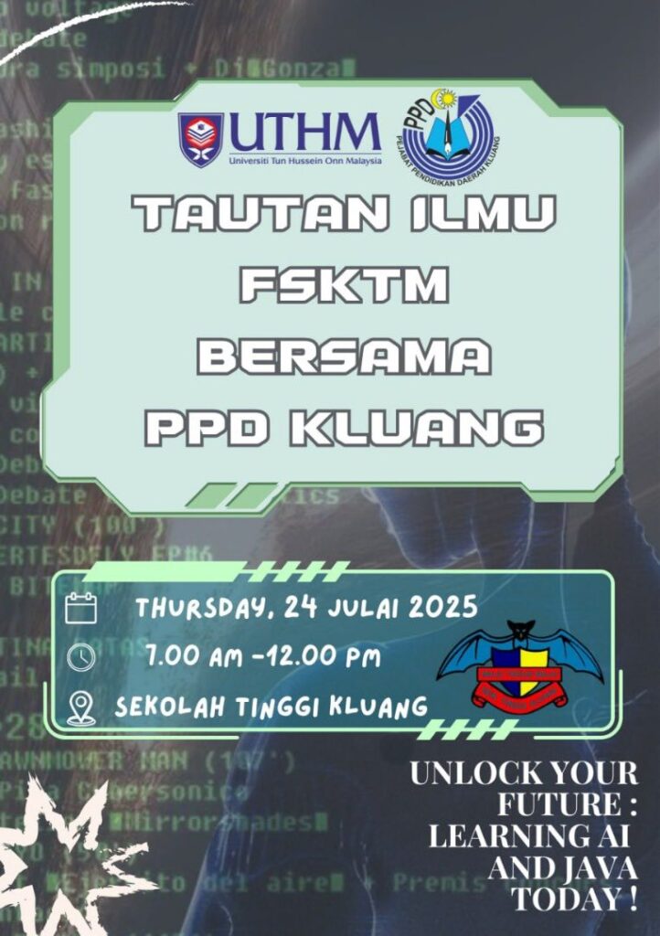 Program Tautan Ilmu FSKTM UTHM dan PPD Kluang telah berlangsung di Dewan Bestari Sekolah Tinggi Kluang pada 24 Julai 2025. Program ini melibatkan murid Tingkatan 4 sekolah-sekolah Daerah Kluang yang mengambil subjek Sains Komputer untuk peperiksaan SPM 2026.