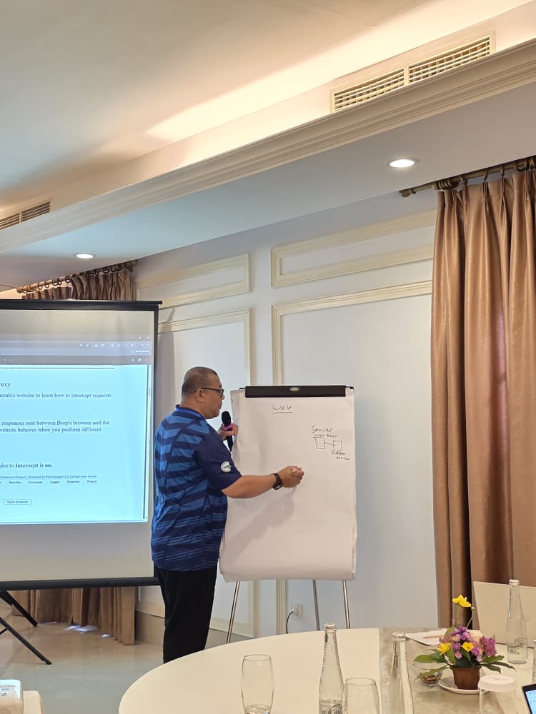 Sepanjang program berlangsung, Ts. Dr. Zubaile Bin Abdullah dari FSKTM telah menyampaikan taklimat mengenai asas keselamatan maklumat serta pengenalan kepada aplikasi “WackoPicko”. Beliau kemudiannya mengendalikan demonstrasi teknik penetration testing secara langsung yang memaparkan kaedah mengesan kelemahan keselamatan aplikasi. Aktiviti interaktif seperti mini hands-on, kuiz dan sesi soal jawab turut diadakan bagi menggalakkan penglibatan aktif dan memastikan pemahaman peserta dapat diperkukuh.