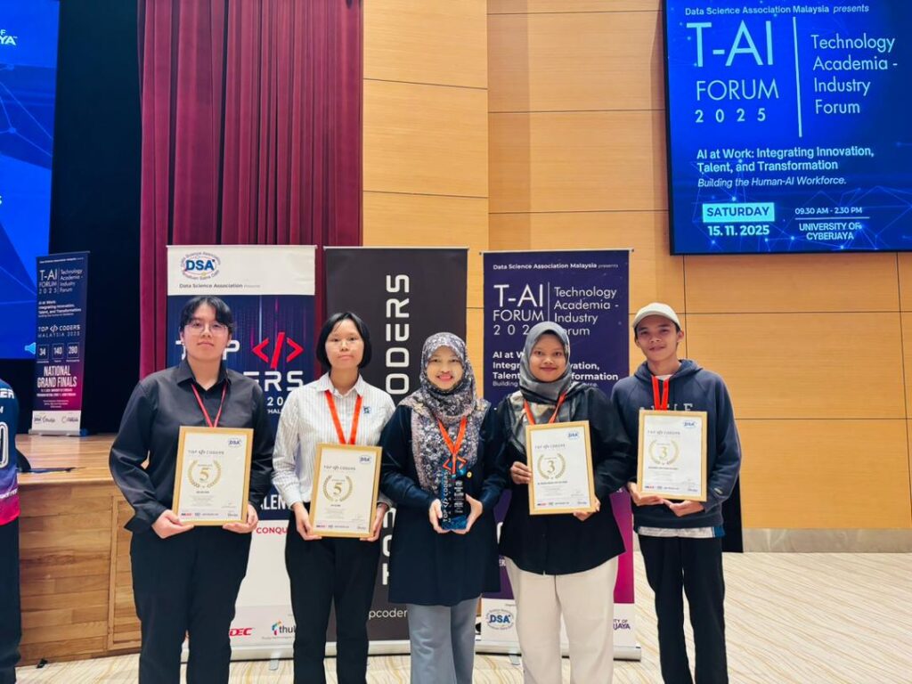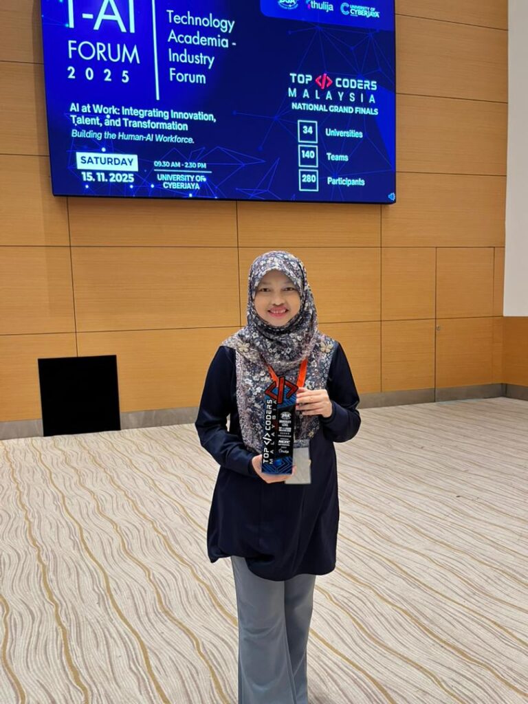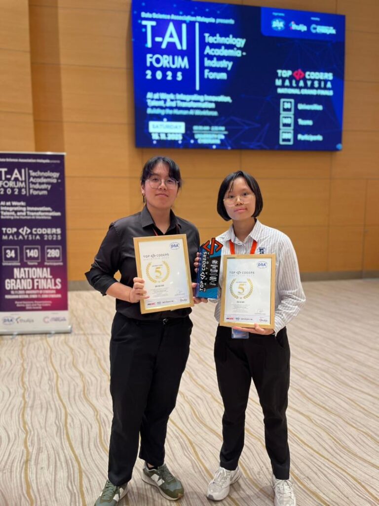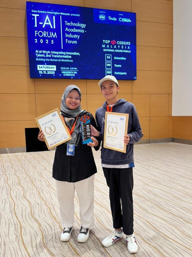 16 NOVEMBER 2025 | “Top Coders Malaysia 2025” is a national-level coding competition for university students, organized by the Data Science Association (DSA) and powered by industry partners such as Thulija. The competition brings together top student programmers from across the country to showcase their skills and creativity. FSKTM is proud to have accompanied two finalist teams from the faculty revenant (Nik Nuraina Umairah Binti Che Harun, Muhammad Amir Syahmi Bin Zuber) and 404 Not Found (Goh Shu Chen, Kek Xiu Min) to Universiti Cyberjaya to participate in The National Level of the Top Coders 2025 Coding Challenge.